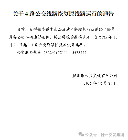 關(guān)于4路公交線路恢復(fù)原線路運行的通告